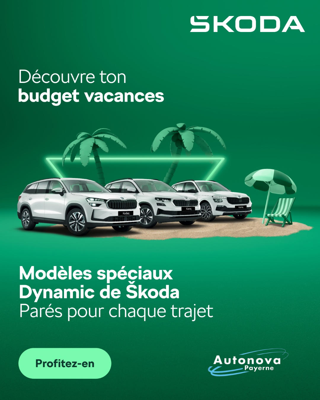 Grâce aux modèles spéciaux Škoda Dynamic, vous disposez désormais d’un budget plus important pour passer des vacances inoubliables. Découvrez de nombreux modèles, dont le Kodiaq, le Karoq et l’Octavia Sportline, équipés des options les plus populaires et bénéficiant d’incroyables avantages prix compris entre 8’100 et 12’880.–. Prenez rendez-vous dès maintenant pour un essai routier chez Autonova Payerne SA.